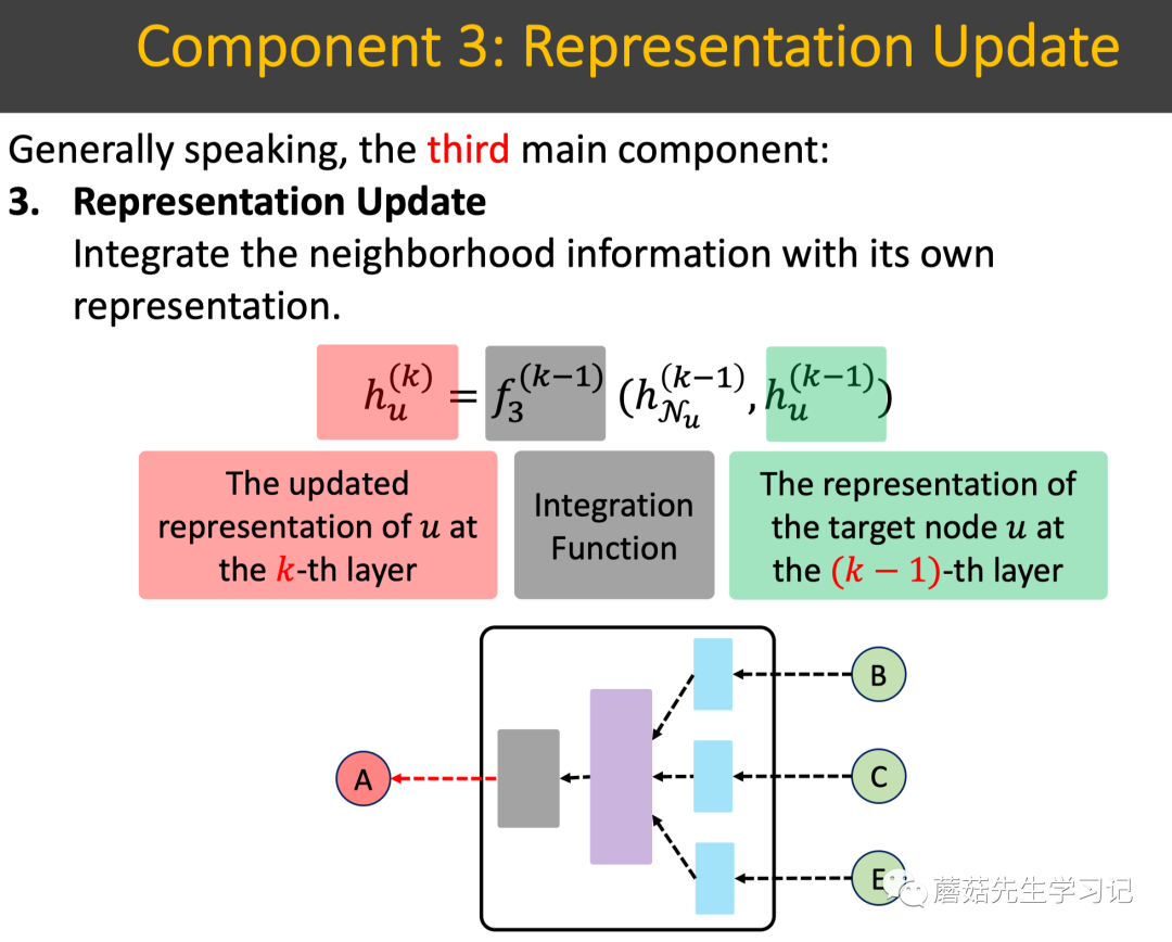 表征更新组件:负责将从邻域结点集合中收集到的信息和本身的信息做一个「融合和更新」。
