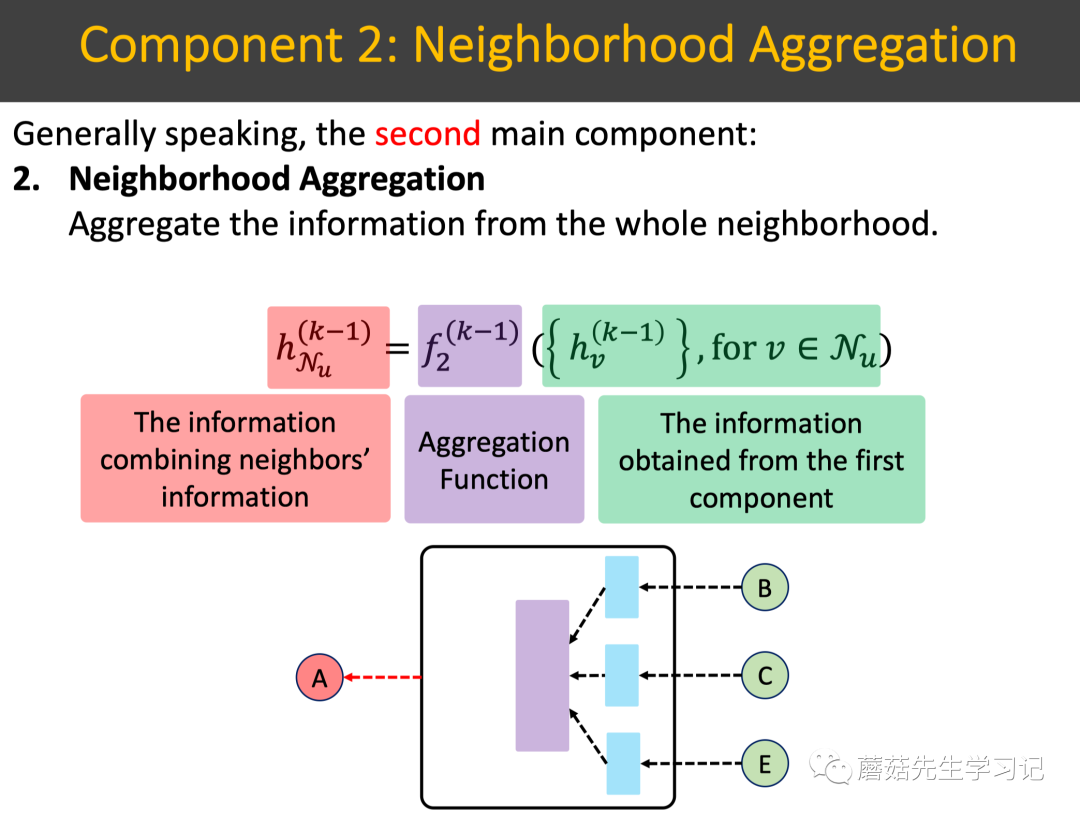 如下图所示,邻域汇聚使用「汇聚函数」,其输入是上述构建好的信息;输出是「汇聚好的所有邻域的信息」。总结下核心的组成元素: