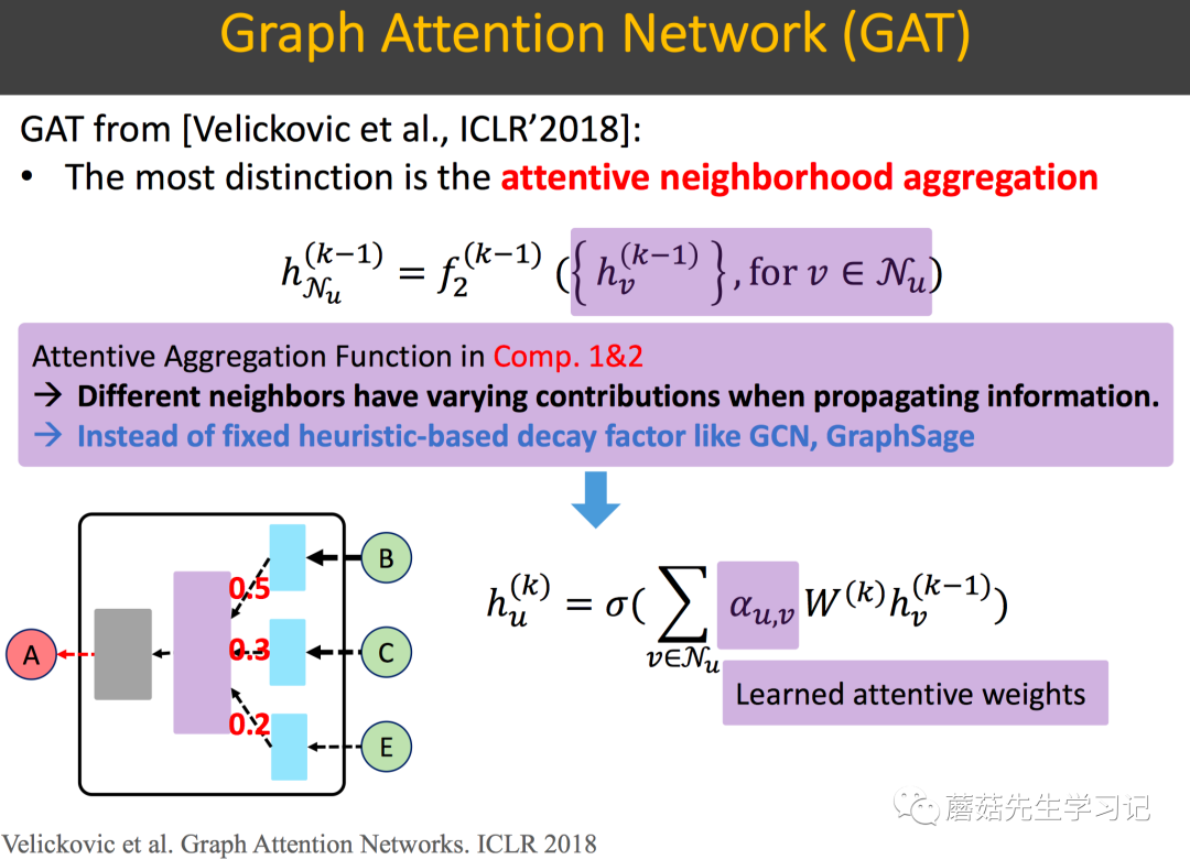 基于注意力框架的邻域汇聚组件。引入了self-attention机制,每个节点attend到自身的邻域节点上。不同于GraphSAGE采用Mean/Pooling Aggregator,GATs采用了基于self-attention机制的Aggregator。也就是说,把目标节点的表示和邻域节点的表示通过一个注意力网络,计算注意力值,再依据该注意力值来汇聚邻域节点。对于节点
