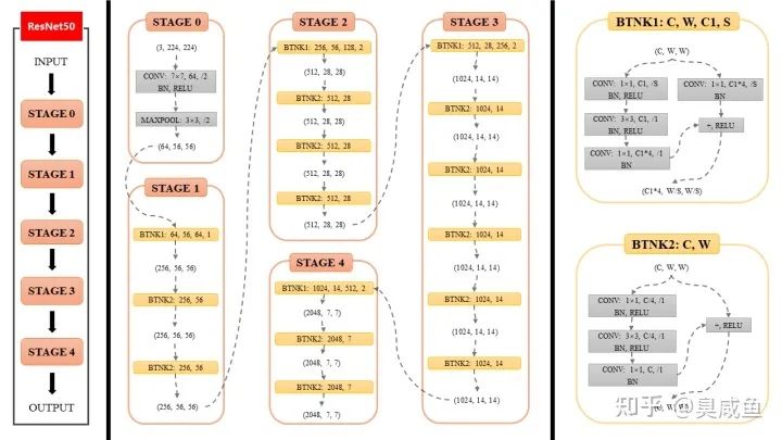 如本图所示,输入INPUT经过ResNet50的5个阶段(Stage 0、Stage 1、……)得到输出OUTPUT。