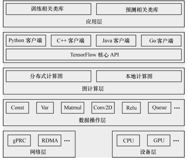 下面就自底向上详细介绍一下 TensorFlow 的系统架构。最下层是网络通信层和设备管理层。网络通信层包括 gRPC(google Remote Procedure Call Protocol)和远程直接数据存取(Remote Direct Memory Access,RDMA),这都是在分布式计算时需要用到的。设备管理层包括 TensorFlow 分别在 CPU、GPU、FPGA 等设备上的实现,也就是对上层提供了一个统一的接口,使上层只需要处理卷积等逻辑,而不需要关心在硬件上的卷积的实现过程。