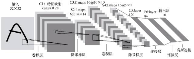 输入层。输入图像尺寸为32×32。这要比MNIST数据集中的字母(28×28)还大,即对图像做了预处理 reshape 操作。这样做的目的是希望潜在的明显特征,如笔画断续、角点,能够出现在最高层特征监测卷积核的中心。