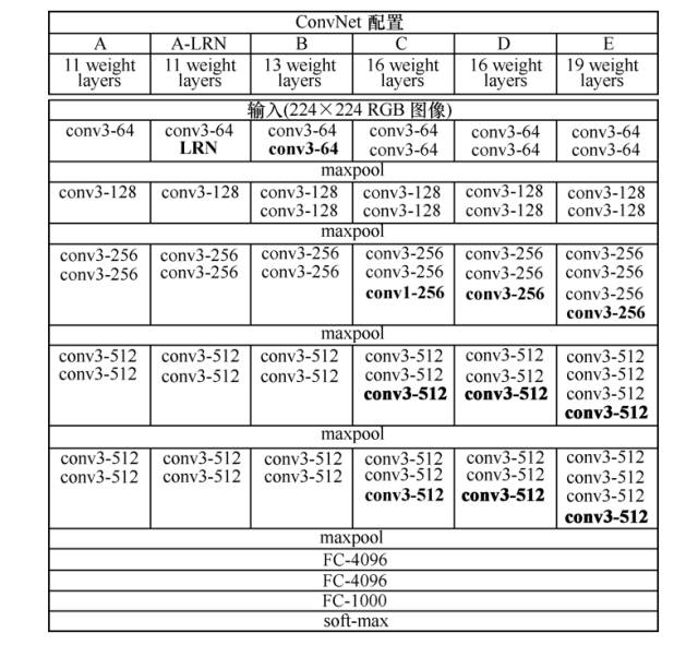 VGGNet 和下文中要提到的 GoogLeNet 是2014年 ImageNet 竞赛的第二名和第一名,Top-5错误率分别为7.32%和6.66%。VGGNet 也是5个卷积组、2层全连接图像特征、1层全连接分类特征,可以看作和 AlexNet 一样总共8个部分。根据前5个卷积组,VGGNet 论文中给出了 A~E 这5种配置,如图所示。卷积层数从8(A 配置)到16(E 配置)递增。VGGNet 不同于 AlexNet 的地方是:VGGNet 使用的层更多,通常有16~19层,而 AlexNet 只有8层。