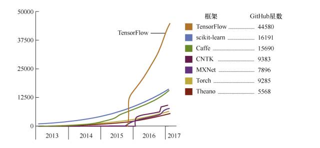 目前市面上的 DL 框架很多,例如 TensorFlow、Caffe、Pytorch 等,框架的性能优劣也有很多人在比较。我们仅从流行度上和转型者上手的难易程度上来看,建议大家首选 TensorFlow。下面是截至到今年3月份的框架流行度趋势图: