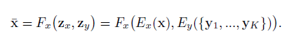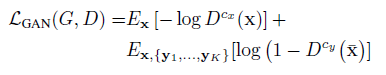 不同于现有的图像翻译研究中使用的条件图像生成器,这里 G 同时采用一张内容图像 x 和 K 个目标类别图像作为输入,并生成输出图像。假定内容图像属于类别 cx,而每个 K 类图像属于类别 cy。另外, K 是个很小的数字,且 cx 与 cy 属于不同类别。如下图2所示。
