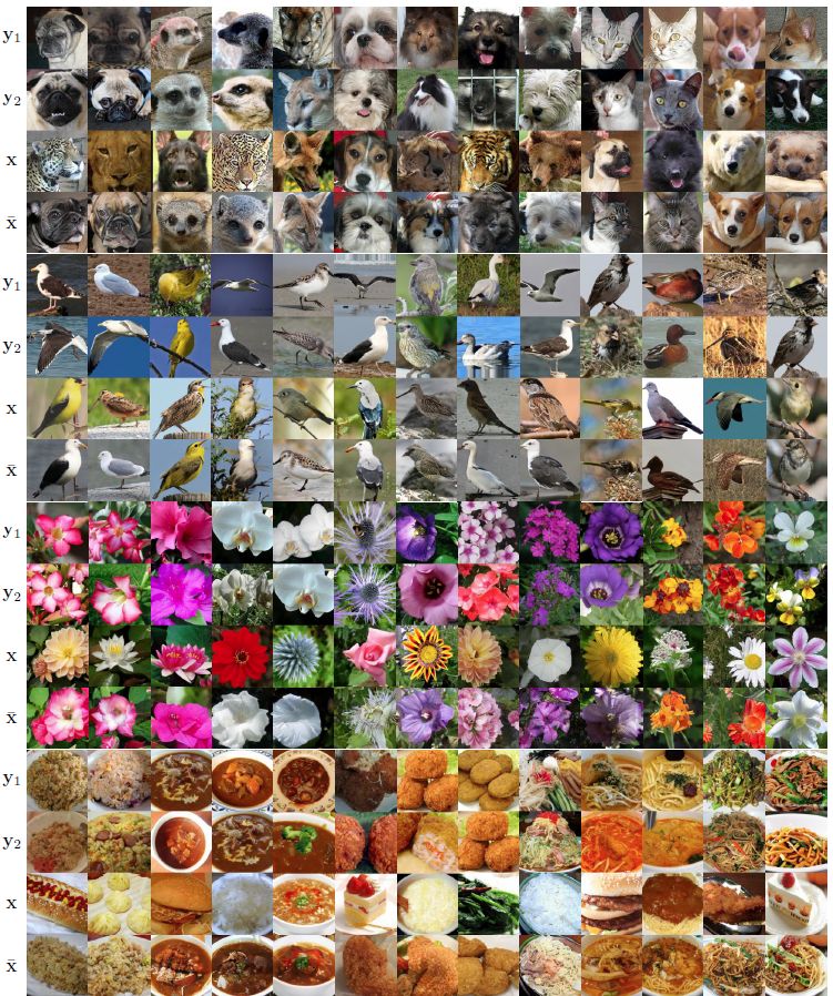 图8 FUNIT-5 模型的少样本无监督图像翻译结果的可视化展示。从上到下,分别采用是动物面孔、鸟类、花卉和食物数据集样本。