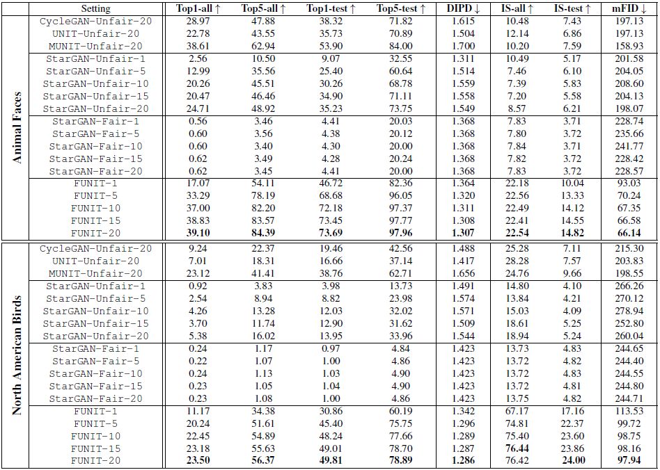 总体结果 FUNIT 与基准方法在不同数据集的实验结果如下图7所示。