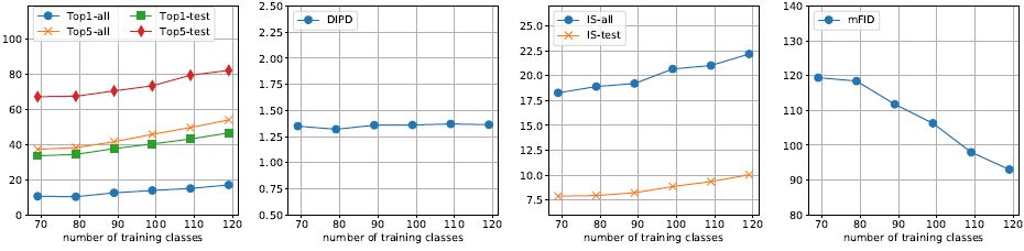 训练集源类别数量 下图11展示了在动物数据集上,当类别数量发生变化时,FUNIT-5 模型的性能表现变化。这里只展示了类别数从69到119以间隔10变化时模型的表现。