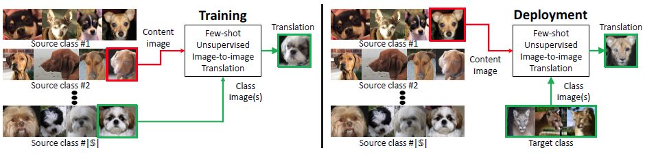 图1 训练:训练集数据由各种不同类别图像构成 (源类别),用于训练一个图像翻译模型。部署:展示了所提出的模型基于少量目标类别图像进行图像翻译的表现。 FUNIT 中生成器的输入由两部分构成:1) 内容图像;2) 目标类别图像集。旨在通过输入与目标类相似的图像来实现少样本图像翻译。