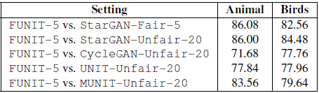 用户偏好得分评估结果表明,相比于其他方法,FUNIT-5 模型的翻译结果与目标类图像的相似度更高,可靠性更强。