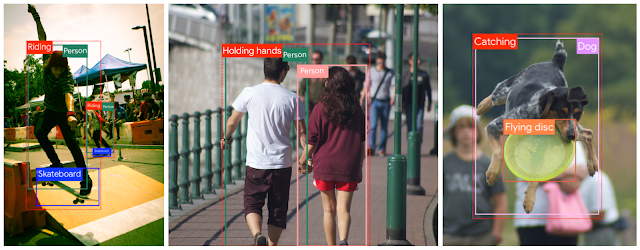 除了在 Open Images V6 中引入局部叙事功能以外,我们还将 视觉关系标注 (Visual Relationship Annotations) 类型增加了一个数量级(多达 1400 种),新加入了如“男子玩滑板”、“男女牵手”和“狗抓飞盘”等视觉关系。