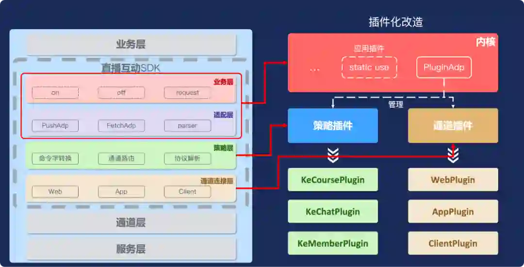 我们改造的方案是进行插件化处理,将接入层(业务层)和适配层作为 SDK 的内核抽离出来,并添加了 pluginAdaptor 对插件进行适配管理,将策略层和通道连接层的逻辑进行抽象处理,制订好对应的规范,根据抽象类和业务需求实现对应的策略插件和通道插件。