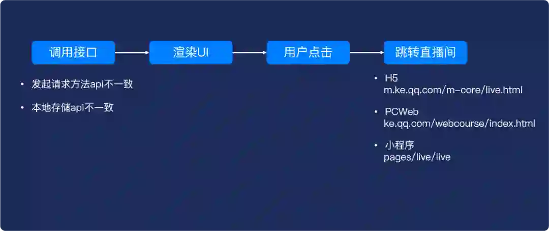 可以看到,业务的主逻辑在各端都是一样的,但如果去看这些逻辑的细节就会发现其实各端需要的是不一样的实现,比如发起请求的 api 在浏览器和在小程序中是不一样的;提示的疲劳度控制需要用到本地的缓存能力,浏览器和小程序的 api 也是不一样的;然后在业务上,直播间在三端的页面地址也是不一样的。