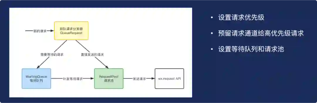 为了优化弱网情况下存在的隐患,我们对请求队列进行了优化,通过设置请求池与等待队列,并劫持 wx.request,在发送请求时对请求的 url 进行优先级排序,将业务请求设置为高优先级的请求,上报请求的优先级降低。当请求通道相对紧张时会将高优先级的请求优先发送,低优先级的请求在请求通道空闲时再进行补发。