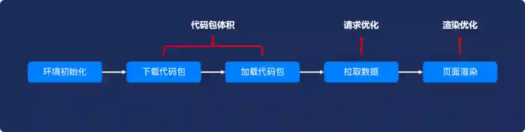 冷启动阶段分为如上几个步骤,其中环境初始化对于开发者来说是个黑盒,目前还无法介入,而下载代码包和加载代码包的耗时,主要与小程序代码包的体积正相关,数据拉取需要开发者对请求时机进行优化,页面渲染则需要优化渲染策略。