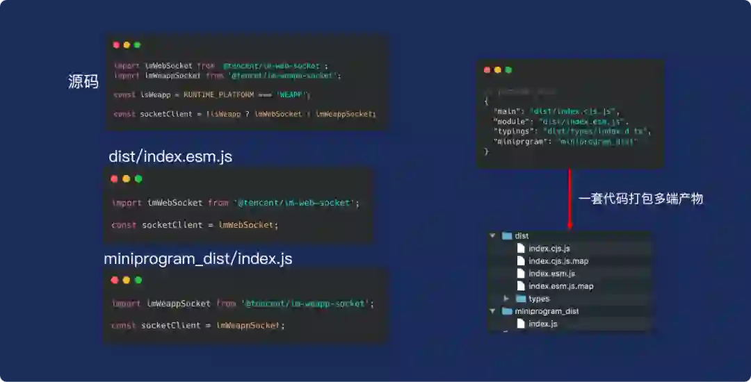 兼容性上通过 rollup 打包,在构建时注入不同的环境变量,输出对应端所需要用到的 bundle。