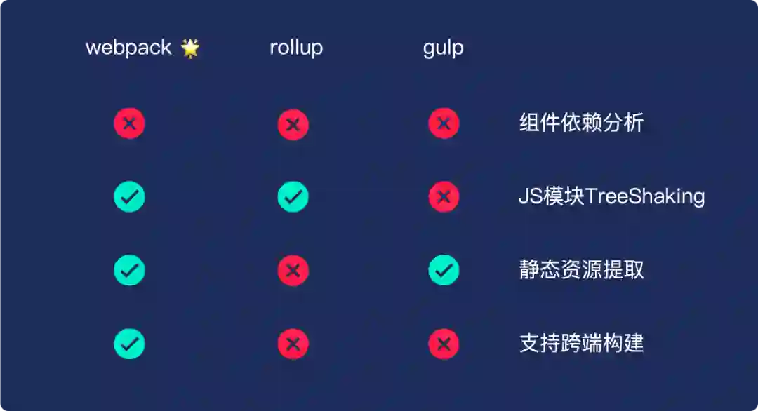 我们面对的上面三个问题有一个核心思路是需要在构建的过程中,针对小程序的规则进行依赖分析。下面是我们对比目前市面上比较成熟的构建工具,从四个维度进行了分析: