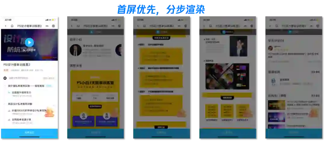 视图渲染和更新可以优化的方向在于,将非首屏和非核心模块数据延后更新,因为 setData 更新视图数据太大会增加通信和解析的时间。以我们最复杂的课程详情页为例,因为模块比较多,导致页面比较长,一般会有 5~7 屏的内容。如果需要等到页面的所有数据全部出完再开始更新试图,那么白屏时间和视图更新时间都会比较长,比较合理的渲染策略应该是首屏优先,分步渲染。