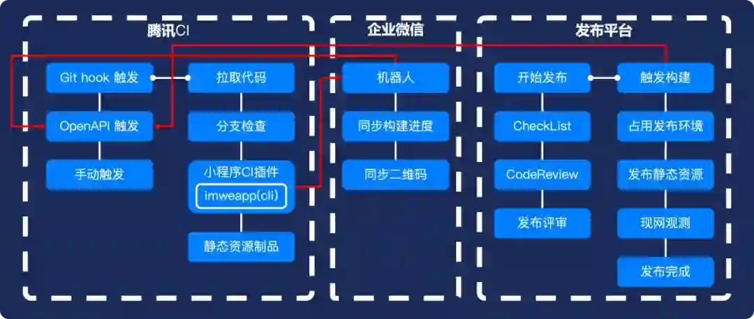 为了解决人工操作带来的隐患,我们从零开始基于小程序提供的命令行工具打造了小程序 CI。让源码编译、构建 npm、上传、生成开发版 / 体验版二维码、自动化测试等流程在 CI 流水中自动流转。