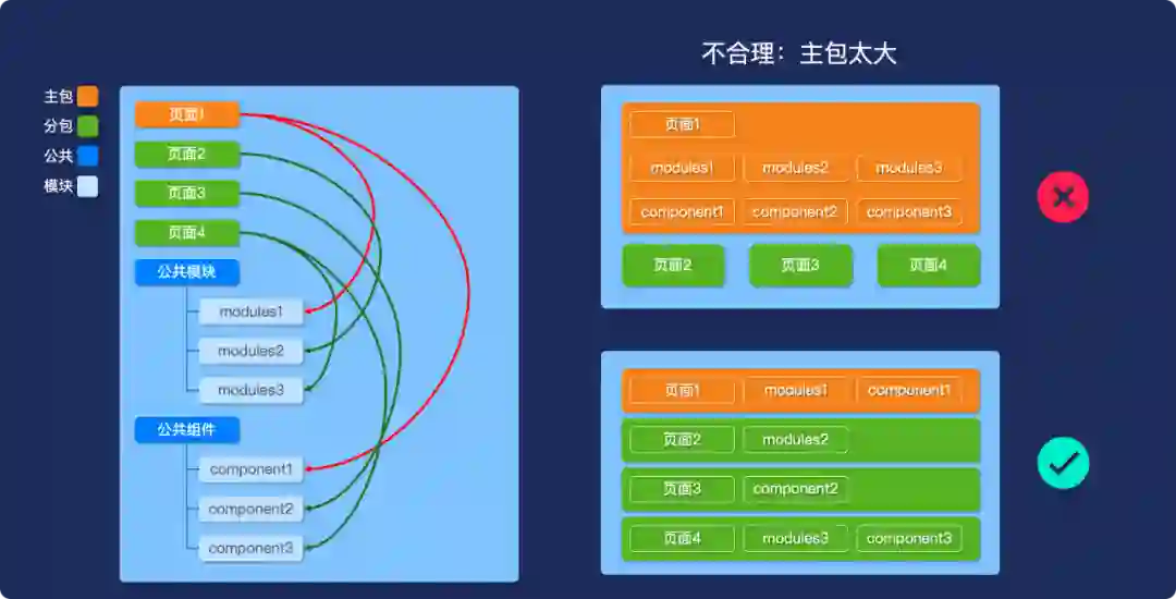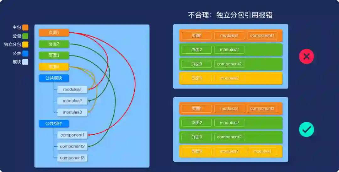 另外,如果某一个分包与主包引用了同一个模块,这时候将这个模块计算到主包中是 OK 的,但如果这个分包是一个独立分包的情况下,再去引用主包的模块,是有可能报错的。上面这种情况需要通过构建的方式将模块复制一份放到独立分包下面才能保证小程序的正确执行。