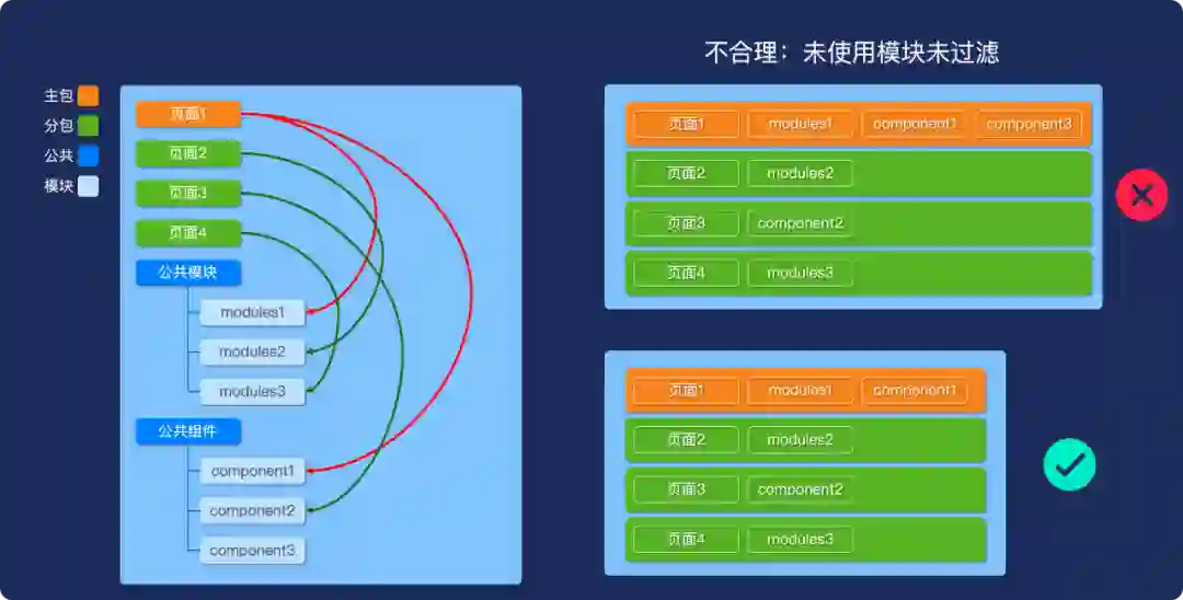 再者,随着需求的迭代,可能某一个组件的引用就丢失了,这种情况在小程序的规则下,依然会被计算在主包里面,可以看下面这张图。我们希望能通过构建将未使用的模块或者组件进行过滤。