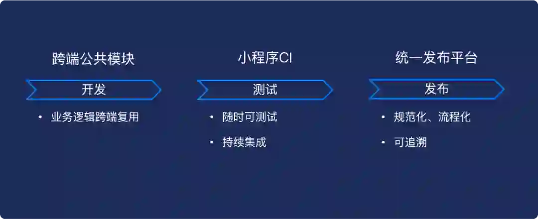 为此我们分别通过打造跨端可复用的公共模块、小程序 CI、统一业务发布平台来提升开发体验。
