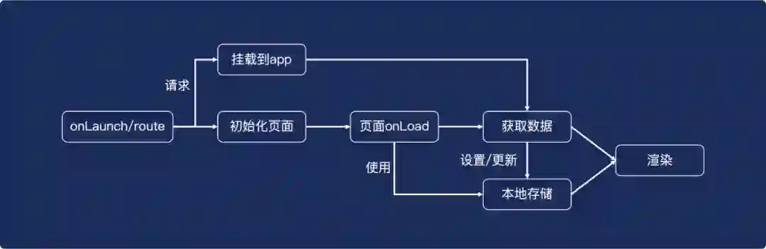 页面加载前发起请求的流程如下,在 onLaunch 或者页面跳转时就直接发起下一个页面的请求,并将请求的 Promise 挂载在 app 实例上,当页面加载完成出发 onLoad 的时候则直接通过 app 上的 Promise 返回进行渲染,根据我们的统计平均可以优化 100ms 的耗时,而且相对静态的数据可以通过本地缓存的方式,在二次加载此页面时通过缓存数据渲染,达到秒开的效果。