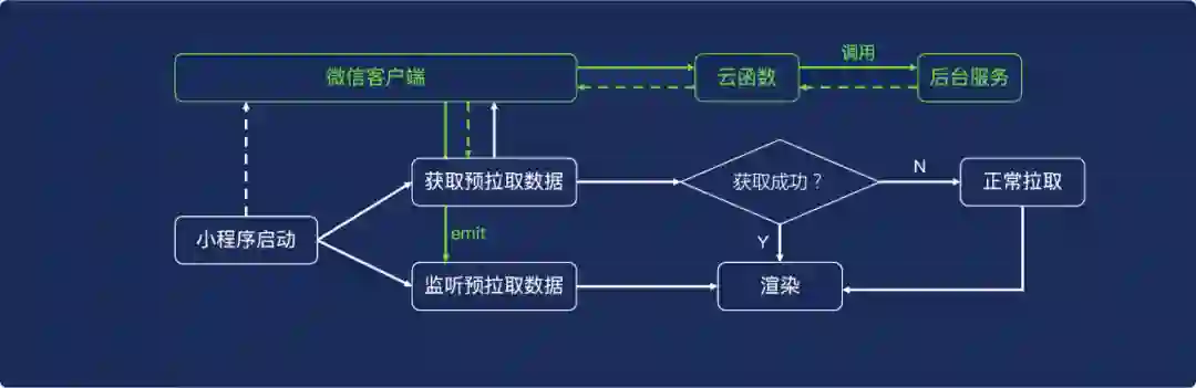 而数据预拉取则类似于 web 的服务端渲染,在启动小程序时通过云函数根据启动参数调用业务后台的服务获取数据并返回给小程序,小程序启动后就可以直接使用预拉取的数据进行渲染,预拉取成功可以平均优化 90% 的首屏数据请求耗时。