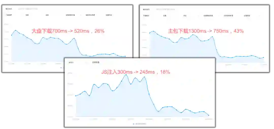 我们的优化在实际的启动耗时上也有比较显著的效果,主包下载耗时优化了 43%,js 的注入耗时优化了 18%。