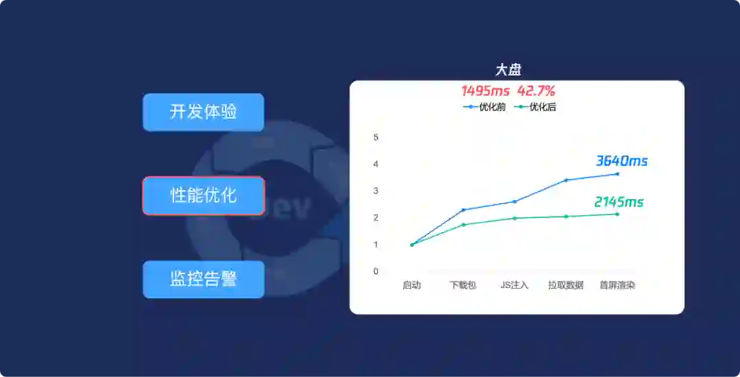 在性能优化方面,我们通过在体积、请求、渲染方面的优化,将冷启动下的首屏性能优化了 1.5s,达到了 42.7% 的优化比例。