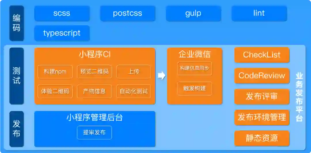 为了解决发布流程不规范的问题,我们将小程序的发布也接入到了业务发布平台。在发布平台上进行 CheckList、CodeReview、发布评审、发布环境管理、发布静态资源等流程的流转,确保需求发布的质量、合规和有序。