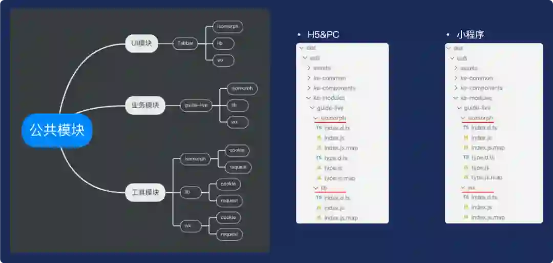在开发阶段通过路径别名来统一引用路径,例如小程序的项目中设置 tsconfig.json 的 paths 为"ke-modules/*": "submodules/ke-modules/*/wx",这样就可以统一业务层面的代码逻辑。在构建阶段 submodule 会通过 ts 单独编译成 js,如果是 h5 和 PC 的项目就只会将 isomorph 和 lib 目录构建到产物中,小程序的项目就只将 isomorph 和 wx 目录构建到产物中。