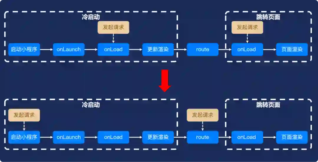 请求的优化也是小程序性能优化中很重要的一环,在冷启动和页面跳转的过程中,我们分别对请求时机以及弱网阻塞两种情况进行了优化。