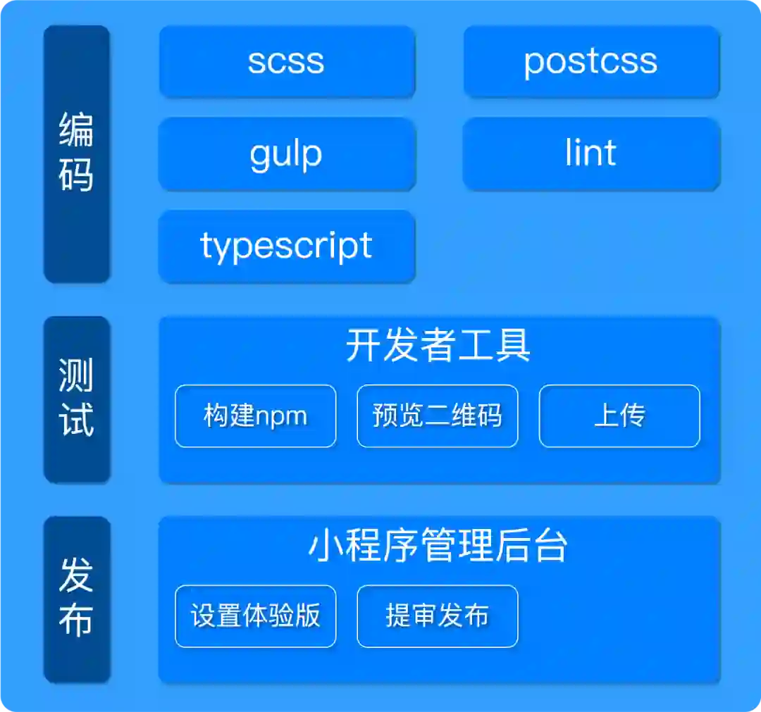 在我刚进入团队的时候,腾讯课堂小程序的工具链还处在比较原始的阶段。除了在编码层面利用了 web 比较成熟的 scss、postcss、lint、typescript 结合 gulp 做一些语法层面的编译以外,在测试、构建 npm、上传、设置体验版、发布等阶段都是依赖的小程序开发者工具和管理后台,人工手动操作来完成的.