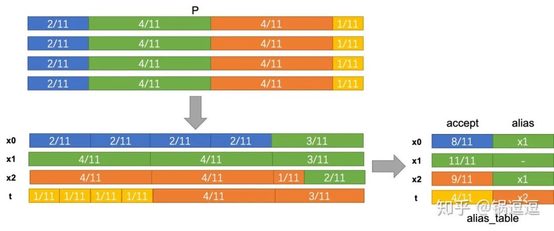 step2:计算accept = {8/11, 1, 9/11, 4/11};alias = {x1, -, x1, x2}