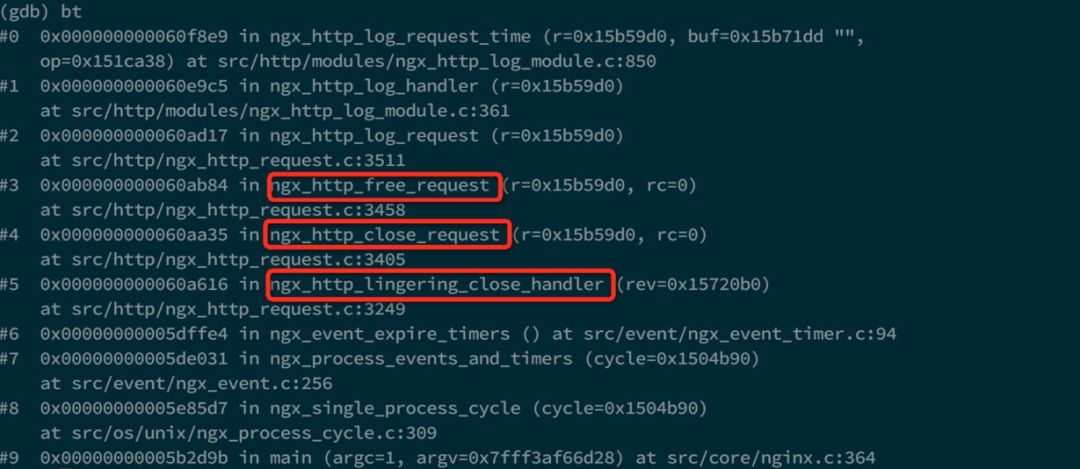 在几个猜想都不对后,觉得还是应该调试一下 Nginx 代码才能发现问题。因为担心直接 gdb 调试可能会导致 Nginx 的性能下降,以至于不能触发可以打出奇怪日志的条件,因此我想到了一个简单的变通方法:只要能获取计算 request_time 之前的所有函数调用栈,那么也就能够大致知道时间花在哪了。根据这个思路我修改了一下 Nginx 源代码,在获取时间的地方有意加了一个对内存的非法访问: