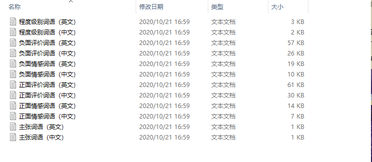 这份中英文情感分析用语词集包含了约17887个词语。其中包含正面情感、负面情感、正面评价、负面评价、程度级别、主张六个子类。