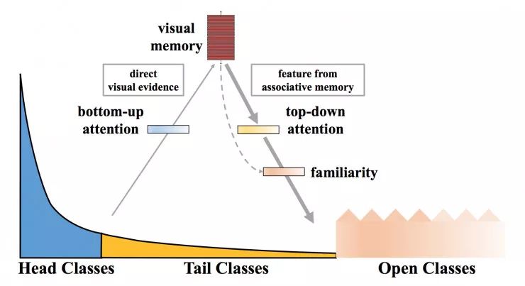 首先,我们通过聚集源自头部类别和尾部类别的知识获得了视觉记忆;然后将存储在内存中的视觉概念当作关联的记忆特征重新注入,以增强原来的直接特征。我们可以将其理解为利用诱导知识(即记忆特征)来帮助实现直接观察(即直接特征)。我们进一步学习了一个概念选择器来控制所要注入的记忆特征的数量和类型。由于头部类别知识已经获得了丰富的直接观察,所以它们只被注入了少量的记忆特征。相反,尾部类别获得的观察很少,于是记忆特征里的关联视觉概念就非常有用。最后,我们通过计算出获得视觉记忆的可达性,来调整开放类别的可信度。