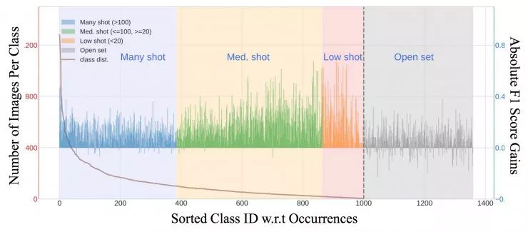 如图 5 所示,本文方法对所有的多/中/小样本类别以及开放类别进行了综合处理,在各方面都取得了实质性的提升。