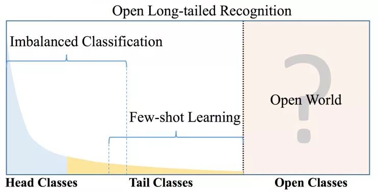 OLTR 并没有局限于字面上的定义,目前有三个问题和它密切相关,分别是不平衡分类、小样本学习和开集识别,通常人们都是孤立地看待它们,分别独立研究。图 3 概括了它们之间的差异。在评估视觉识别系统方面,新提出的 OLTR 可以成为更广泛、更现实的检验标准。
