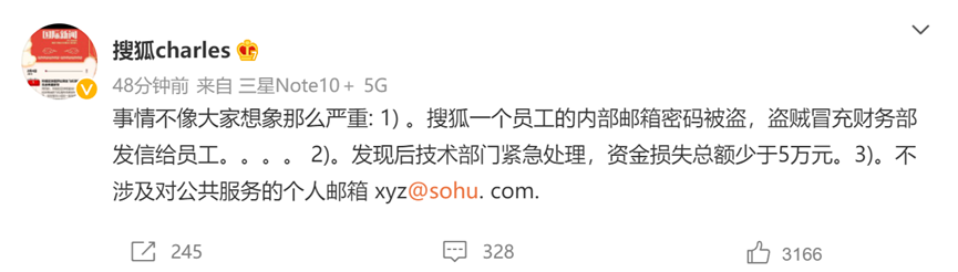 其实纵观整个骗局,除了利用了员工薪资保密的规定,其核心一步还是来自盗号导致邮箱密码泄露使得发信地址是搜狐内部邮箱,从而给予了这封粗糙的邮件很大的置信度。