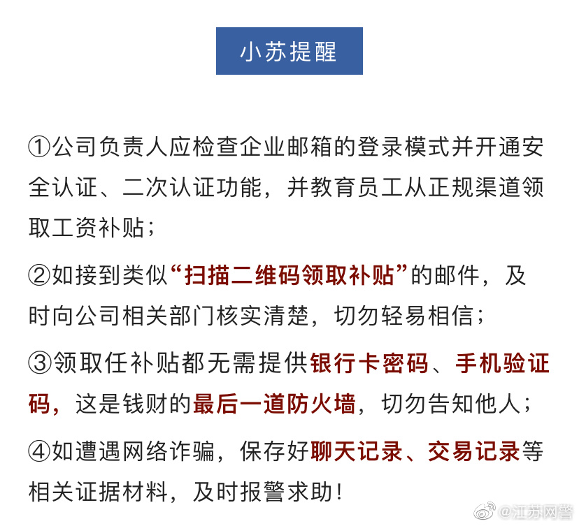 而消极一点也要提醒一下自己“不要把鸡蛋放在一个篮子里”,如果工资卡内就是自己的全部家当,那麻烦就不止是公司发布里的“不到四万块钱”那么简单了。总而言之,遇到这种诈骗邮件,Copy 江苏网警的一段话就是: