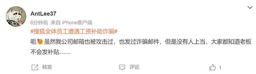 5月18日,搜狐公司全体员工收到了一份发信地址来自 sohutv-legal@sohu-inc.com 的邮件,这一地址来源于公司内部域名,邮件中注明“搜狐财务部“,内容是关于5月份的工资补贴通知。根据流传的聊天记录显示,许多员工按照附件要求完成扫码,填写银行账户信息等操作,最终导致工资卡内的余额被悉数划走。