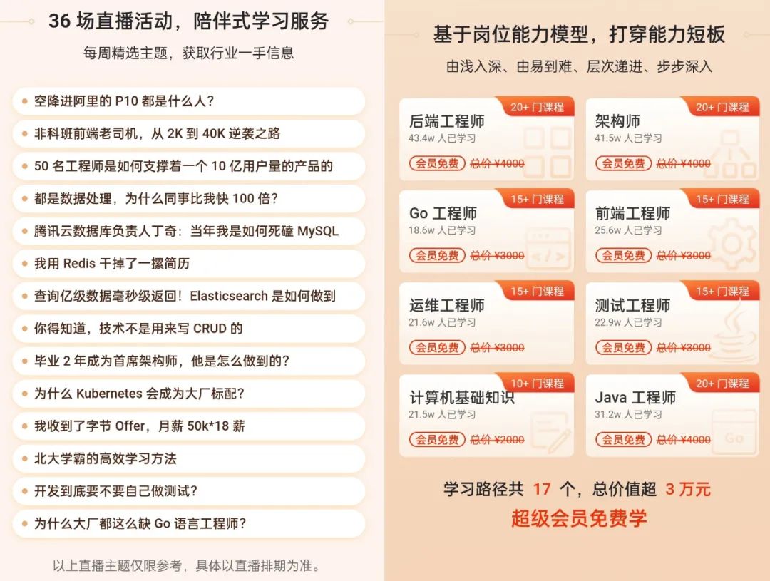 做好垂直领域的深耕、系统化地训练,职业发展会更加稳健。我们结合市场需求、热门岗位招聘 JD,完善了 17 条领域学习路径,比如 Java 工程师、Go 工程师、云原生工程师等等,从小白、高级开发、资深专家、架构师、CTO 的全链路职业发展模型,跟着学,成长不迷路。