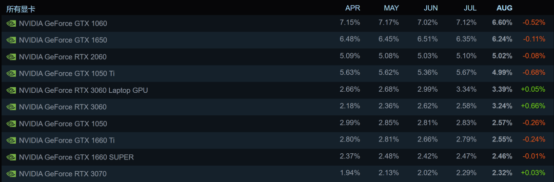 前十名中,只有一款3070位居末席,其余全部是XX60以下级别的显卡。