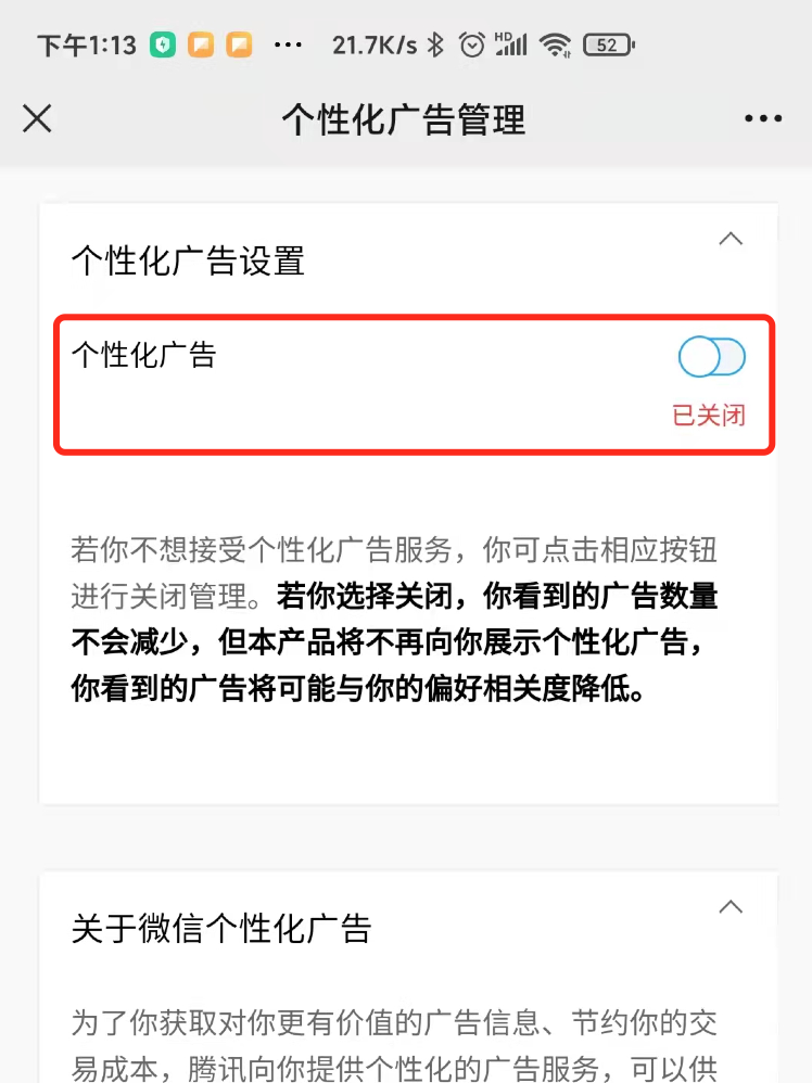 微信已在最新的8.0.16新版本中,提供了「个性化广告推荐」关闭功能。