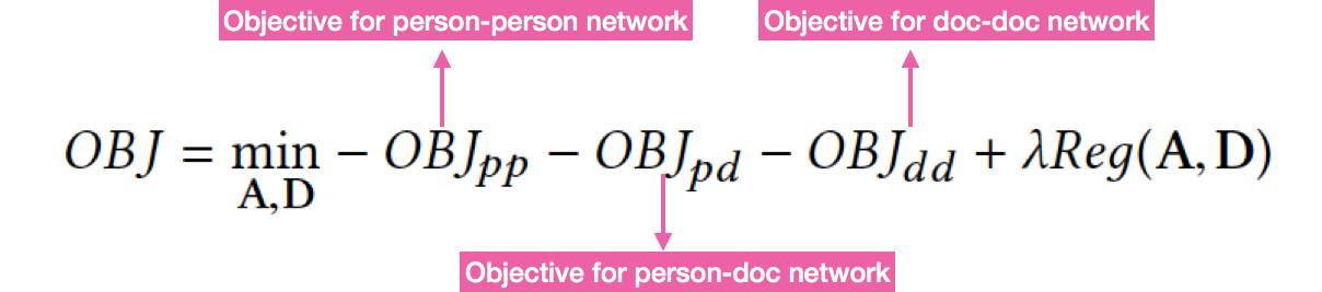 基本假设:存在LINK的节点间Embedding距离 < 无LINK的节点间Embedding距离,定义异构网络的LOSS,计算梯度迭代求解,得到“Document”的embedding后聚类。