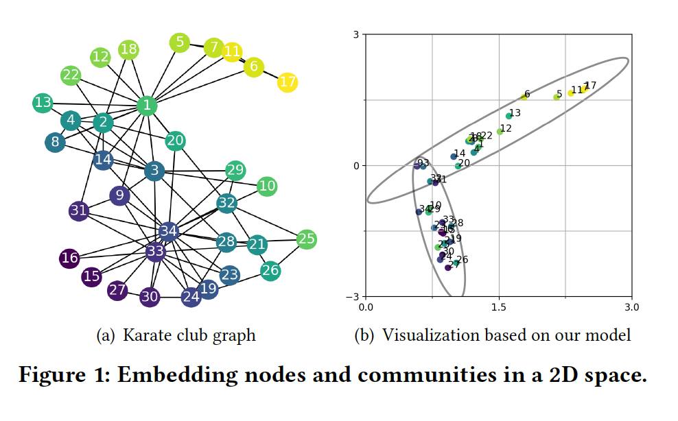 解读:community embedding,网络社区结构的向量表达,通常是其节点集合的向量分布(多元高斯分布)。基本假设:节点embedding,与其所在社区的中心节点相似度高,这个假设约束有助于Node Embedding更好的引入网络高阶信息,进而更好的支持community detection。当前,community embedding, community detection and node embedding这3大任务通常都作为独立的问题去解,本文提出一个闭环算法结构,算法的输出同时包含节点向量、社区向量以及最优社区结构划分。