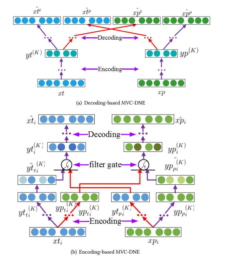解读:区分网络多种构成方式,比如:社交关联、资金转账网、属性相似性网等,从不同的视角分别做节点embedding,再基于Attention机制融合不同的embedding结果。整体框架如下图:
