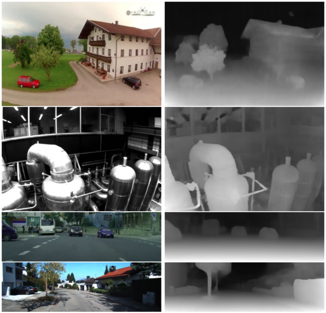 图1:从未知来源的视频中学习深度的方法的定性结果,通过同时学习相机的外在和内在参数来实现。由于该方法不需要知道相机参数,因此它可以应用于任何视频集。所有深度图(在右侧可视化,作为差异)都是从原始视频中学习而不使用任何相机内在函数。从上到下:来自YouTube8M的帧,来自EuRoC MAV数据集,来自Cityscapes和来自KITTI的帧。